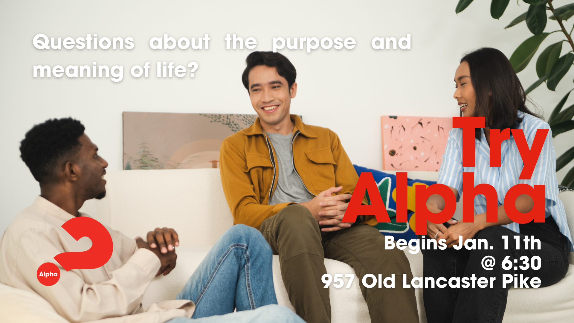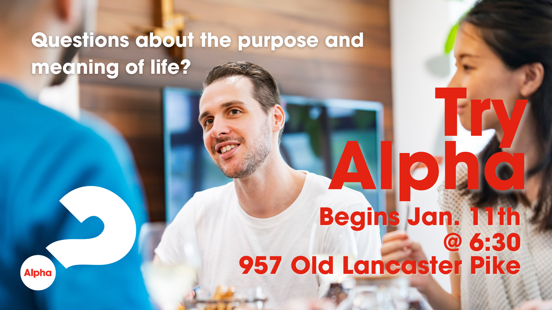 Are you curious about faith? Do you ever wonder what your purpose in life is? We invite you to join our upcoming Alpha course where you can address these questions and more with like minded people, and hear what Christianity has to offer. It's free and open to anyone, no matter your beliefs, religious affiliation, or convictions. Dinner will be provided. Sign up below!